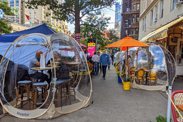 随着时序入秋,气温渐凉,纽约市餐馆户外用餐的环境受天气影响不小。上西区一家餐馆“Cafe Du Soleil”利用透明、外型像是气泡的塑料帐篷招揽顾客,受到民众的欢迎。