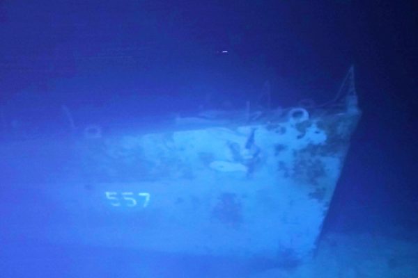 “我们在海底6,456米深处找到了约翰斯顿号前半部三分之二的残骸主体。当时我们的三名潜水员进行两次潜航,并向罹难的勇敢船员致敬。”