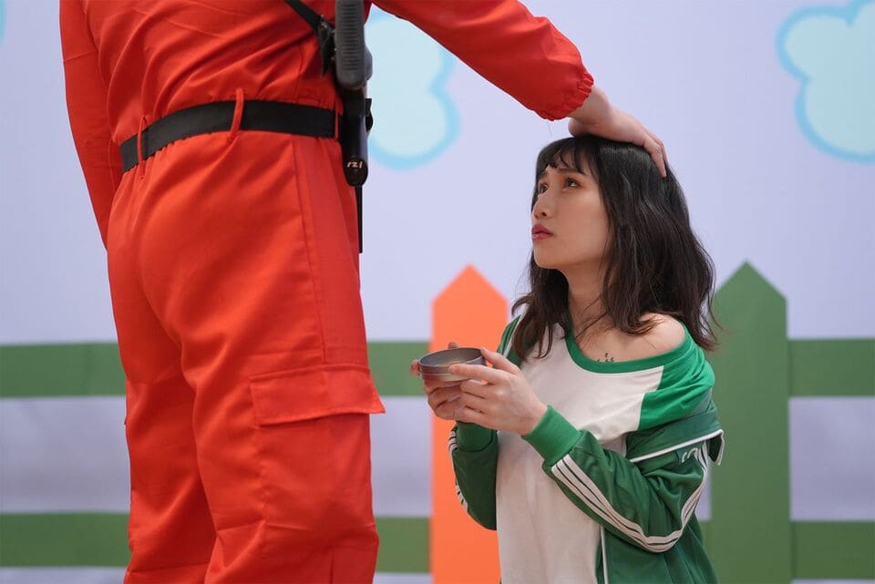 ▼吴梦梦穿上橙色连身裙扮演木头人女孩,至于被淘汰的女优就要被士兵处置。