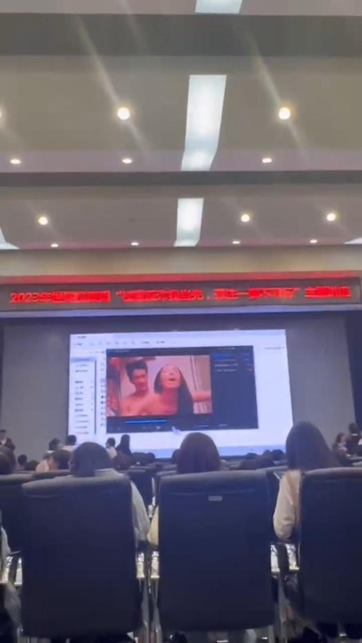 起初大屏幕播放的是宣传教育影片,接着却跳出男女背后位的AA片段,大约持续了8秒后,工作人员才手忙脚乱的停播,但已经被学生即时拍下上传。
