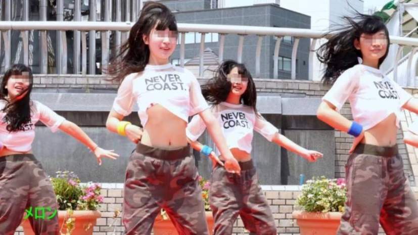 只见左后方一位长头发、右手白色护腕的女孩,在一次舞蹈动作后,T恤里的泳装随着摆动滑落。